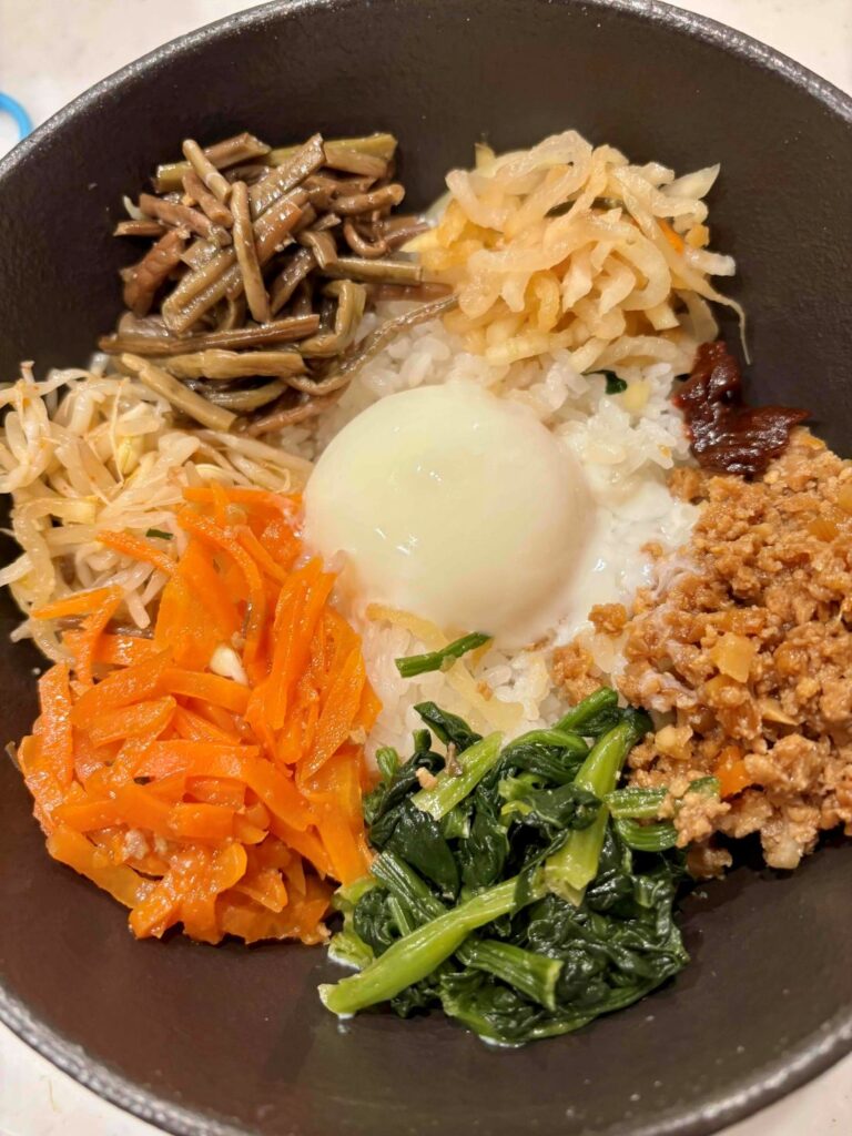 それぞれのナムルの塩味が半熟玉子と混ざり、マイルドにまとまってとても美味しいです😆
