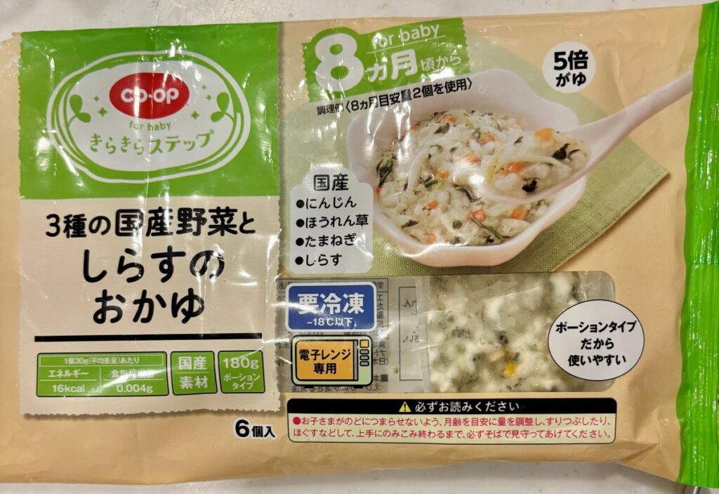 コープの「3種の国産野菜としらすのおかゆ」は、レンジ調理で時短をしながらも